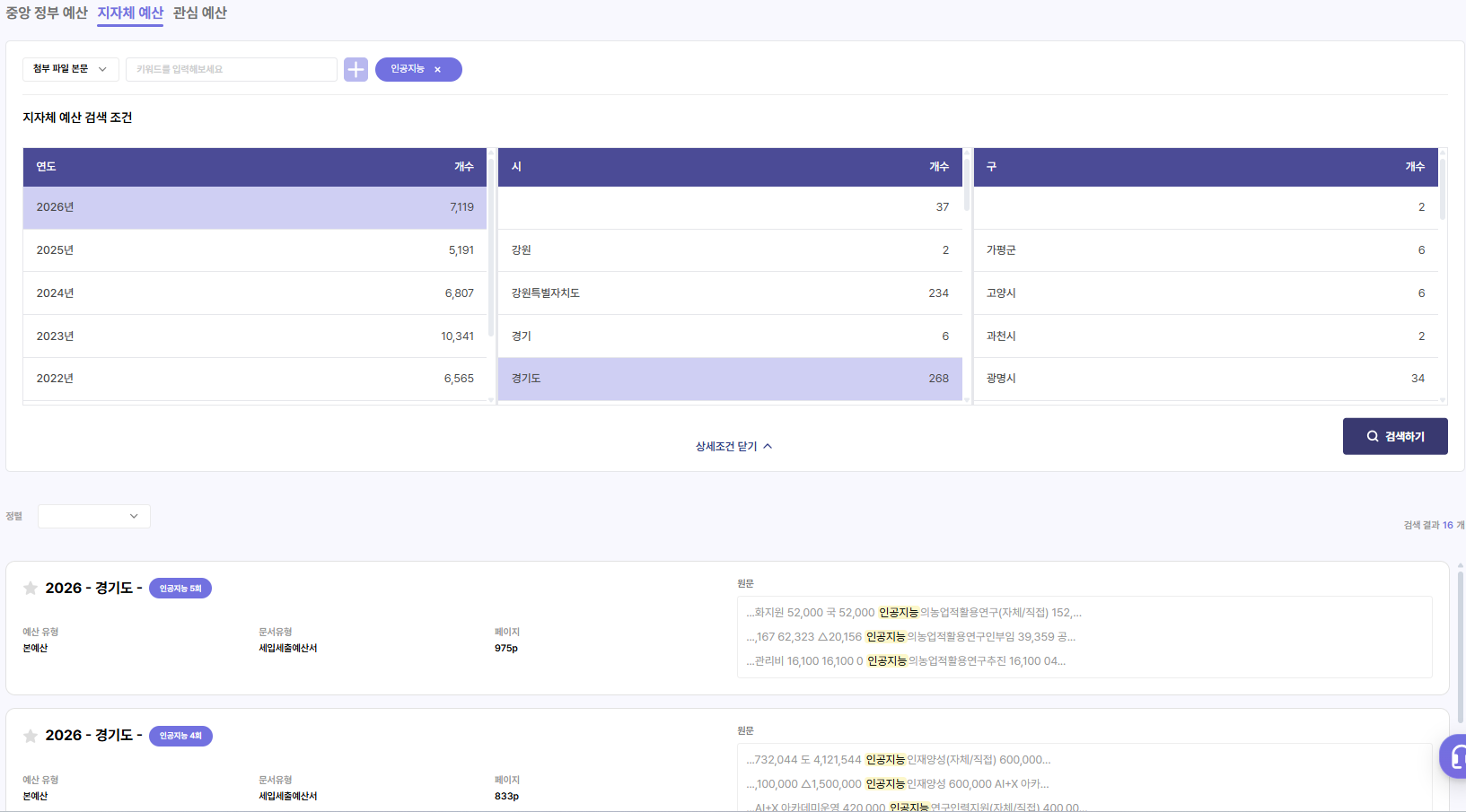 - 우리 회사의 주력 사업(예: '인공지능', 'AI 교육', '노후 인프라 개선' 등) 키워드만 설정하면, 관련 예산이 편성된 지자체 예산을 즉시 리스트업합니다.