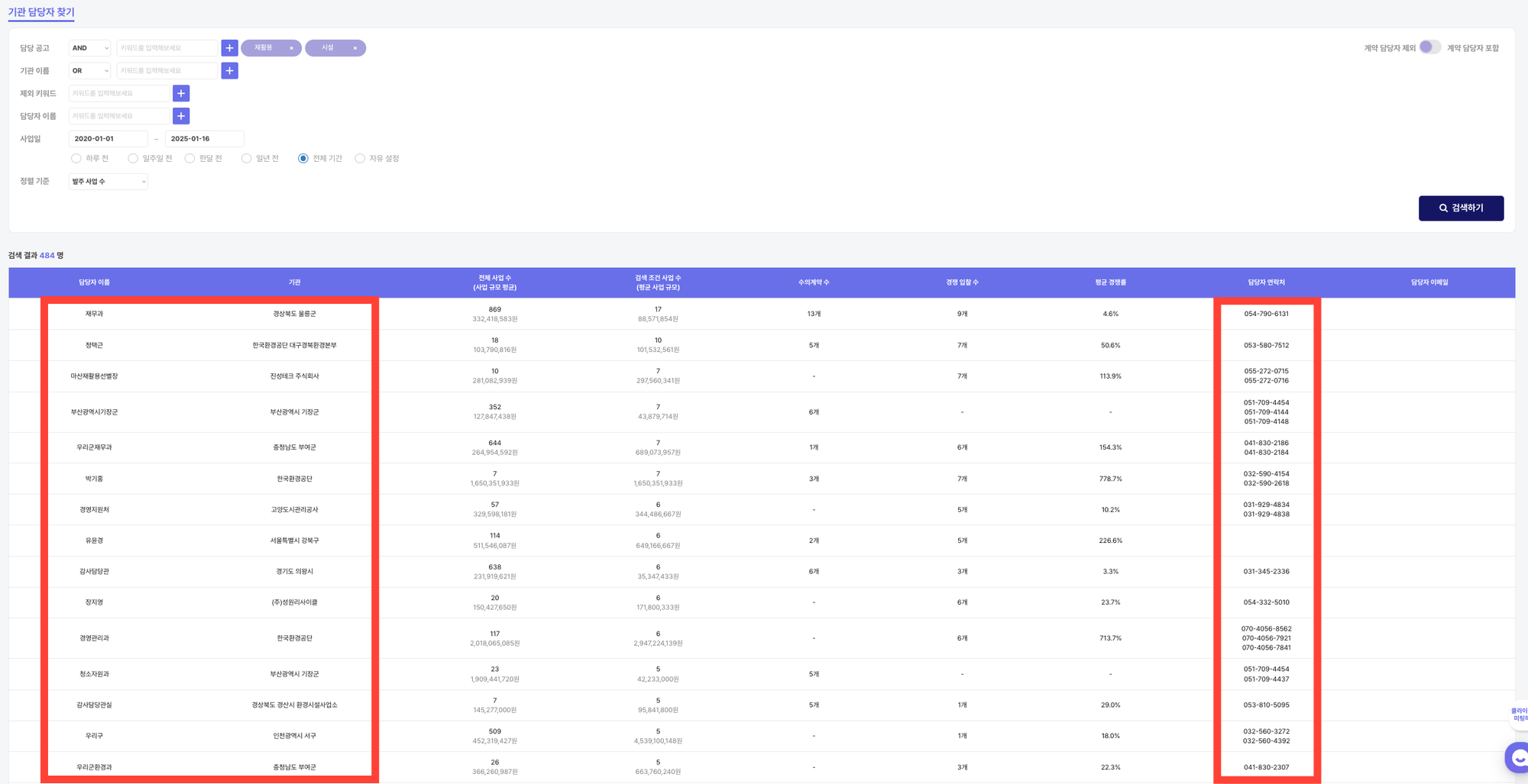 클라이원트는 영업 담당자를 위한 세일즈 네비게이터를 제공합니다. 사용자가 관심 있는 키워드를 입력하면, 해당 공고를 발주하는 기관의 부서명, 담당자 이름, 연락처 등을 리스트 형태로 쉽게 확인할 수 있습니다.