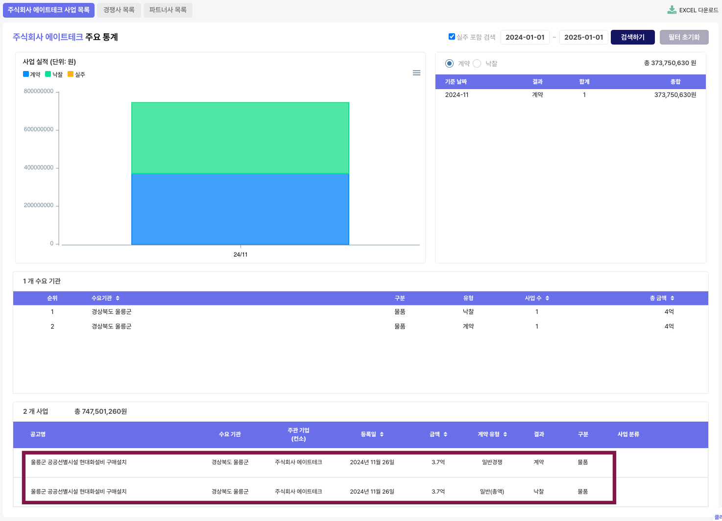 클라이원트는 조달청에 등록된 약 50만 개 기업의 입찰 실적 데이터를 보유하고 있으며, 2020년 이후 수주된 모든 데이터를 열람할 수 있습니다. 이를 통해 경쟁사가 어떤 사업을 수주했는지, 해당 사업이 어떻게 수의계약으로 이어졌는지를 확인할 수 있었습니다. 이를 바탕으로 에이트테크는 보다 쉽게 수의계약 전략을 수립할 수 있었습니다.