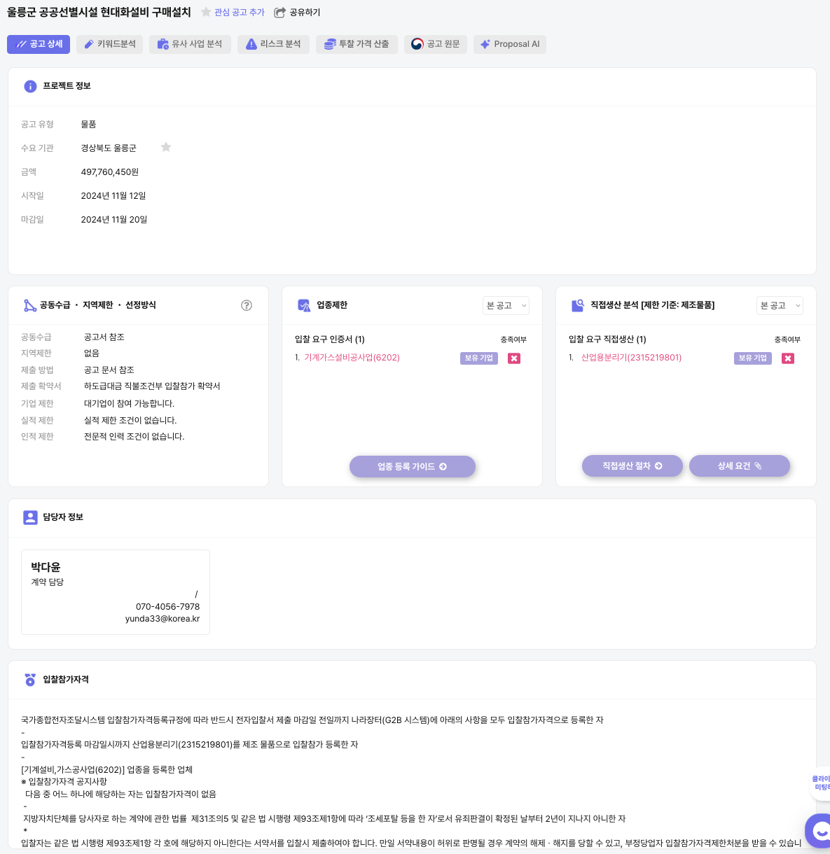이전에는 해당 프로젝트에 대해 사전 정보나 영업 활동이 전혀 없었지만, 공고를 확인한 순간 영업팀에서는 이 프로젝트에 충분히 입찰할 수 있다고 판단했습니다. 이후 빠르게 제안서 작성을 준비하며 입찰에 참여하게 되었죠.