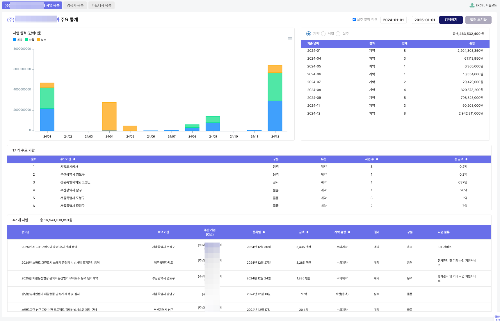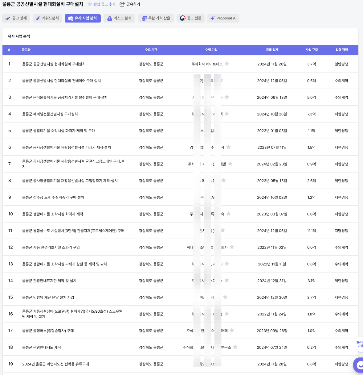 또한 클라이원트는 해당 수요 기관이 과거에 발주했던 유사 사업들을 모두 확인할 수 있는 기능을 제공합니다. 이를 통해 수요 기관과 특정 기업 간의 관계를 합리적으로 추론할 수 있어, 전략적으로 불리한 사업은 피할 수 있는 판단 근거를 제공합니다.