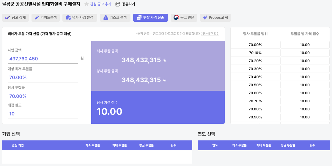 해당 사업은 물품 사업으로, 투찰 가격이 성공적인 입찰의 핵심 요소입니다. 하지만 투찰 가격은 단순하지 않은 시스템으로, 적절히 산정하지 않으면 경쟁에서 밀리거나, 비공개된 적격 금액 범위를 벗어나 탈락할 위험이 있습니다. 예를 들어, 낙찰하한선 또는 상한선 미달이라는 표기가 이러한 상황을 반영합니다.