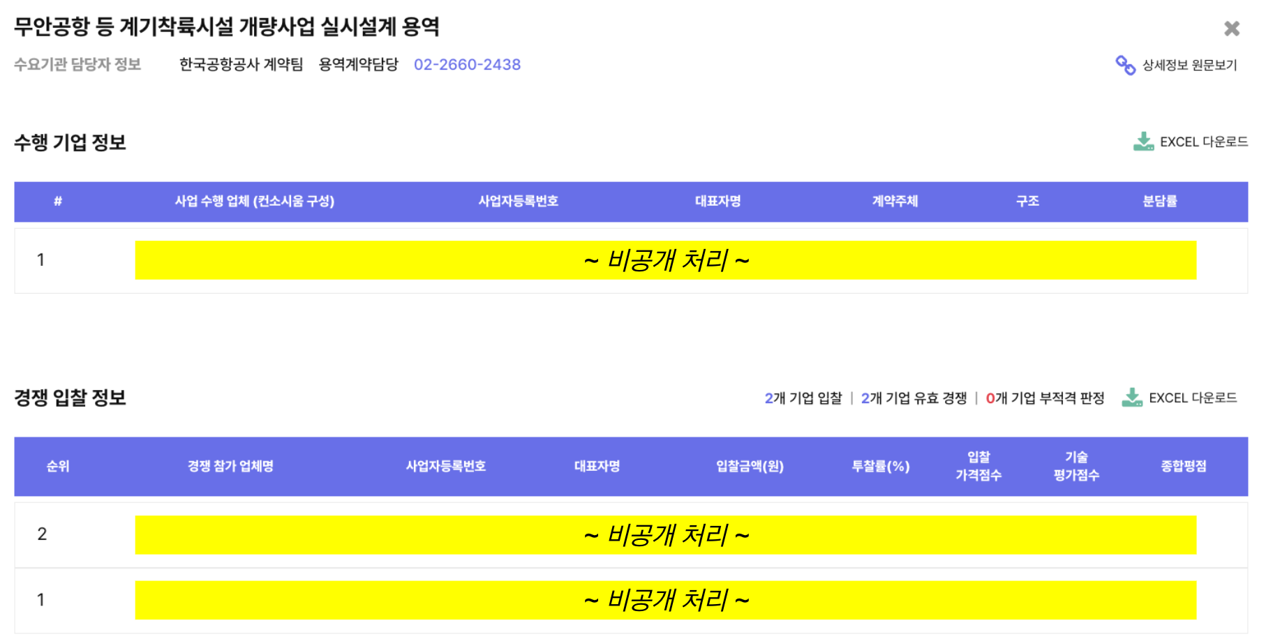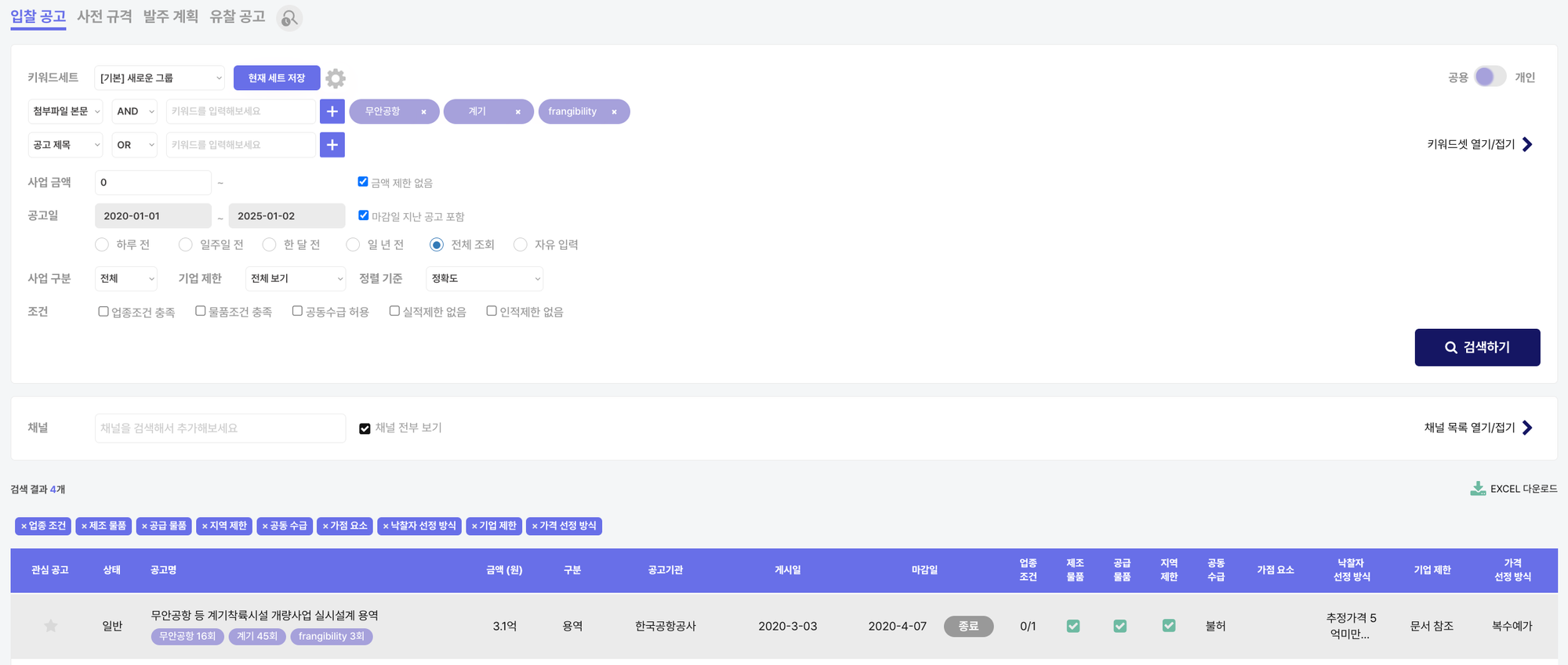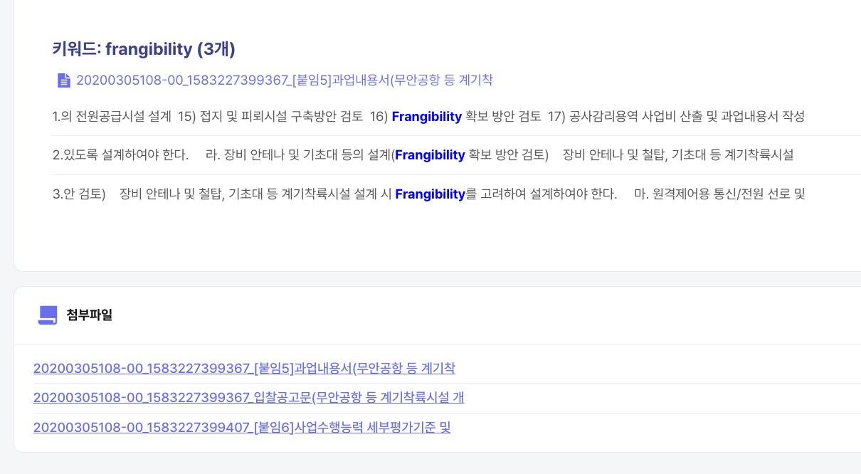 해당 기사를 참고해 클라이원트 내에서 "무안공항," "계기," "Frangibility"라는 키워드로 첨부파일 본문을 검색한 결과, 문제의 입찰 공고를 확인할 수 있었습니다.