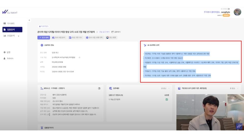 수십 페이지 RFP를 3분 만에 분석하고, 나라장터·해외 입찰까지 한 곳에서 검색. Cliwant 도입을 상담받아보세요.