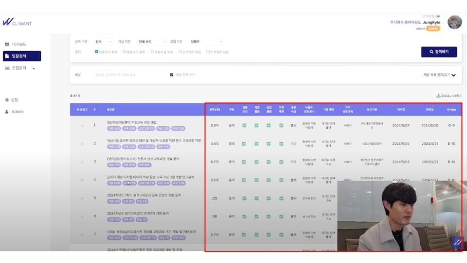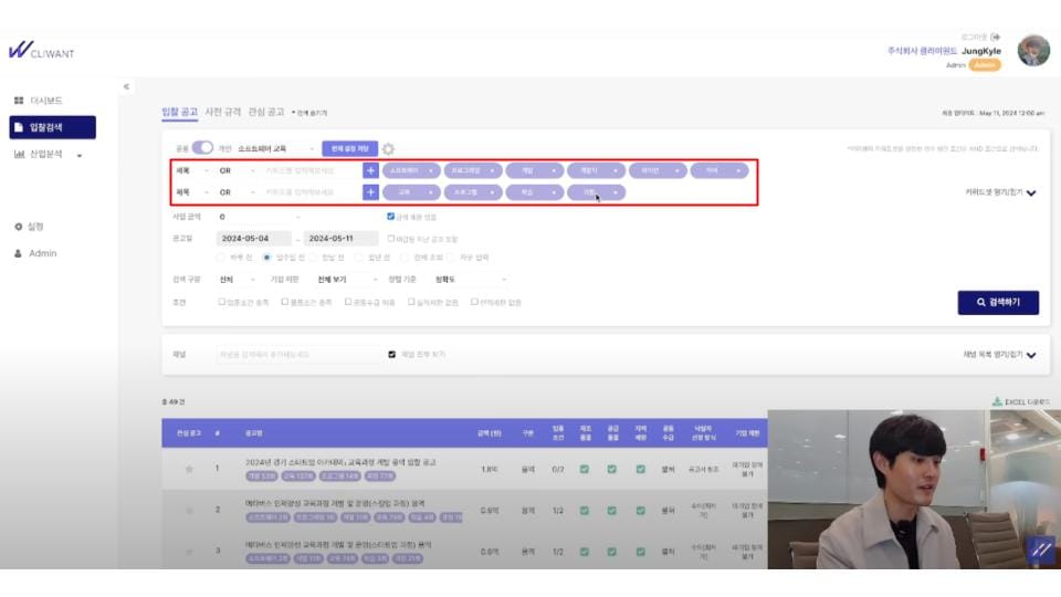 나라장터와 달리 클라이원트에서는 공고의 제목뿐만 아니라 본문도 검색이 가능합니다. 또한, 여러 개의 키워드를 한꺼번에 입력하여 검색할 수 있으며, OR 조건과 AND 조건을 통해 보다 유연하게 검색할 수 있습니다.