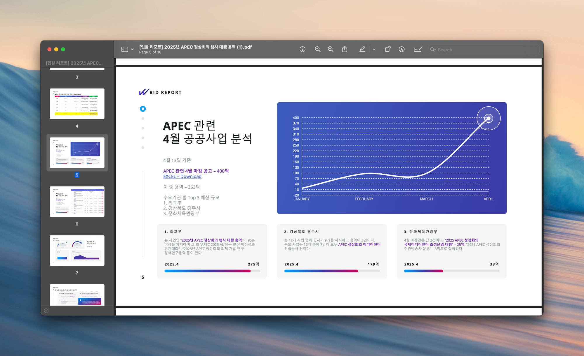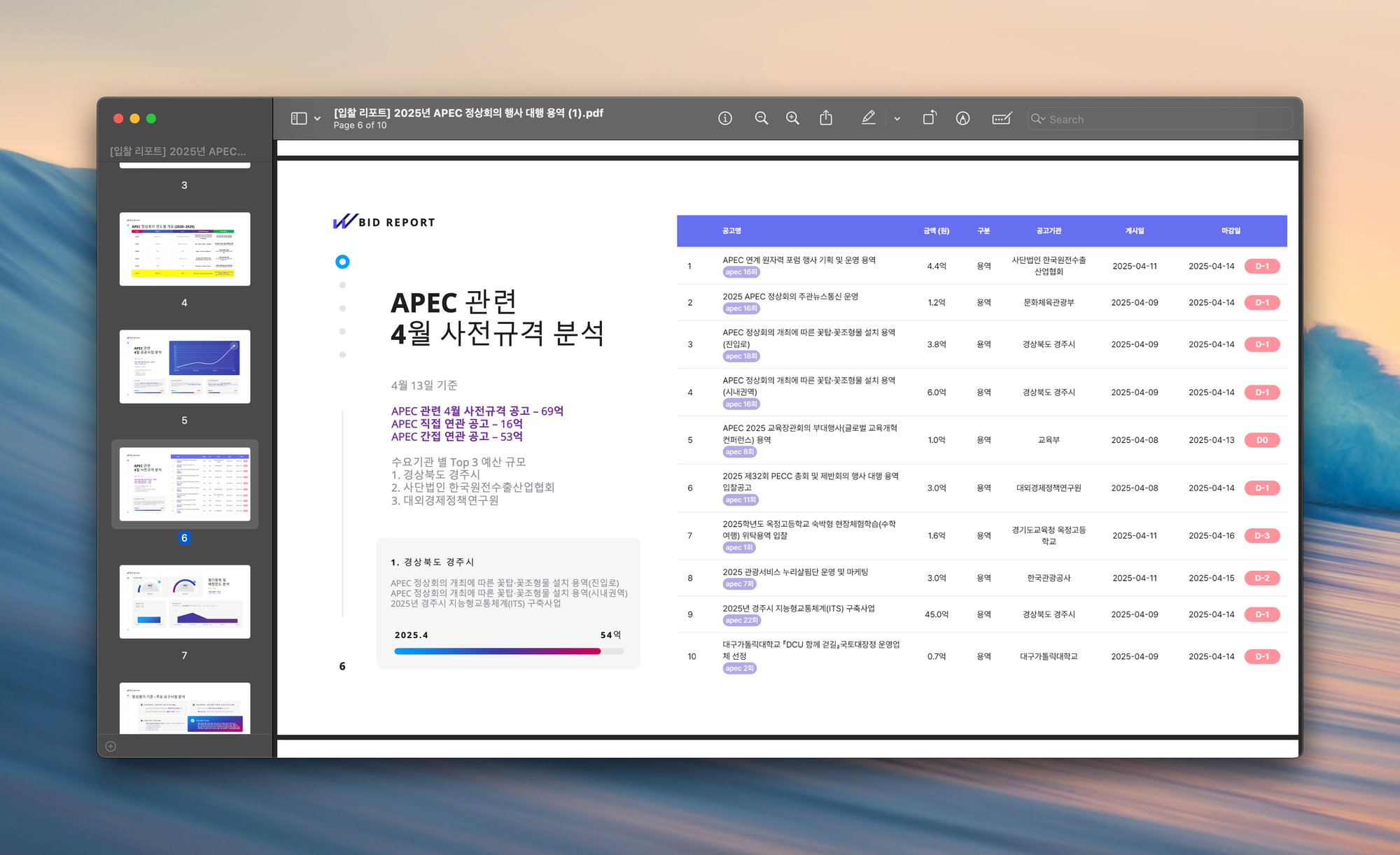 다가오는 APEC 정상회의를 앞두고 관련 공공입찰 프로젝트를 분석한 리포트를 발행했습니다. 이번에 저희도 처음으로 세부 데이터를 꼼꼼히 살펴봤는데, 이렇게 많은 수요기관이 입찰을 올리고 있는 줄은 미처 몰랐습니다.