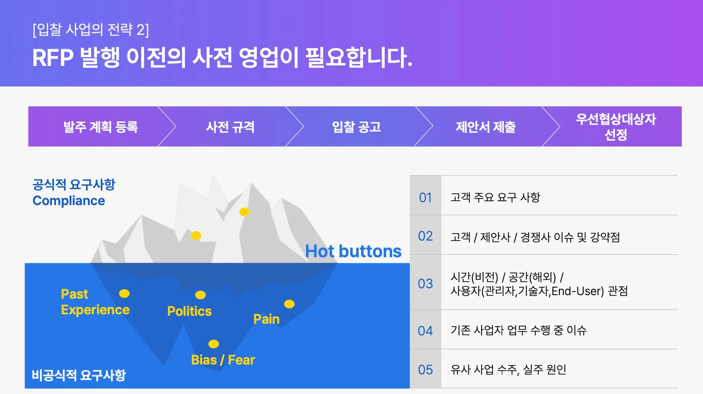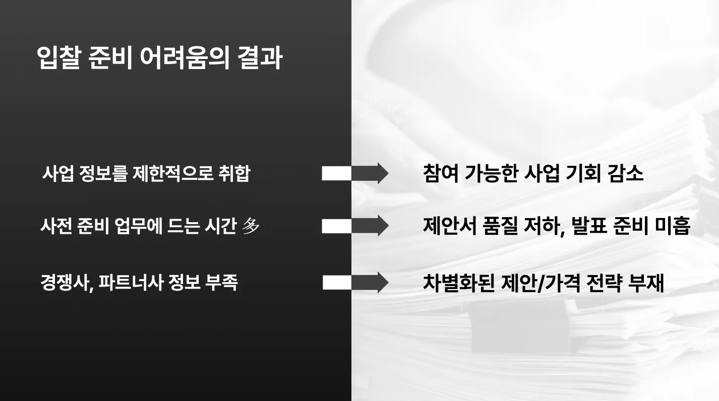 그러나 어썸스쿨이 스스로 느끼기에 가장 취약한 부분은 첫 사업 수주를 위한 사전 영업 단계입니다. 이를 보완하기 위해, RFP가 게시되기 이전 단계부터 사전 규격 공고를 확인하거나 내년도 정부 사업 예산을 분석하고, 필요한 경우 발주처와의 대면 미팅을 통해 정보를 적극적으로 조사하는 전략을 제안하였습니다.