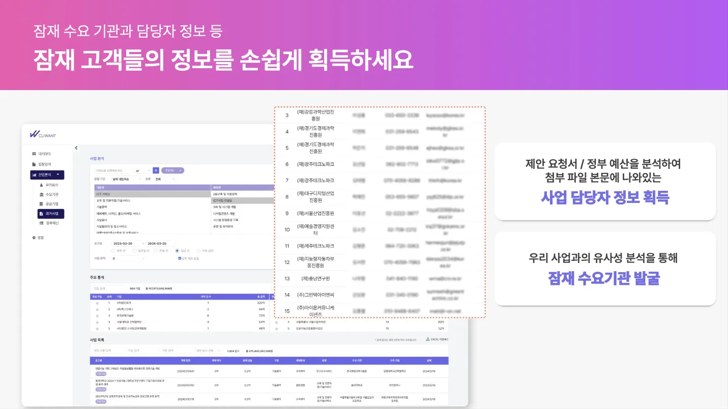 클라이원트는 공공 사업 확장에 강한 의지를 가진 기업과의 협업에 최적화되어 있습니다. 공고가 게시될 때마다 급히 준비하는 기업과, 사전에 체계적인 계획을 수립해 안정적으로 사업을 수주하고 수행할 리소스를 확보하는 기업은 중장기적으로 성장 속도와 성과에서 분명한 차이를 보일 수밖에 없습니다.