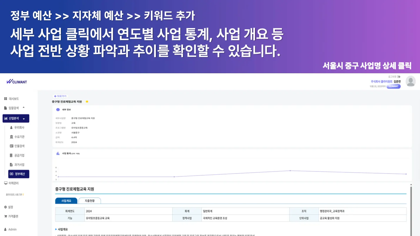 과거에는 입찰 현장이나 나라장터 데이터를 수작업으로 수집하며 제한적인 수준의 시장 조사를 수행했지만, 현재는 클라이원트를 활용해 자사의 시장 입지를 정확하고 효율적으로 분석할 수 있게 되었다고 밝혔습니다. 이를 통해 어썸스쿨은 변화하는 환경에서도 경쟁력을 유지하며 지속적인 성장을 도모하고 있습니다.