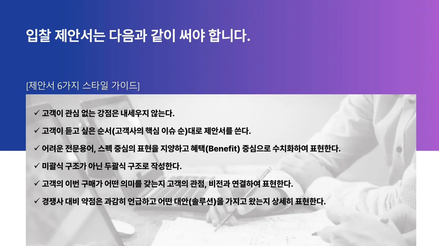 또한, 제한된 리소스를 효율적으로 활용하기 위해 내부적으로 우선순위 체크리스트를 작성하고, RFP를 기준으로 점수를 매겨 일정 기준 이상일 경우에만 입찰에 참여하는 방식으로 시간을 절약할 수 있습니다. (예: 동종 업계 경쟁사 분석, 심사 기준에 따른 심사위원 분석 등) 특히, 교육 서비스 입찰은 공고 후 준비 기간이 약 2주로 짧기 때문에, 입찰 공고를 신속히 파악하고 RFP를 분석해 제안서를 작성하는 것이 중요합니다.