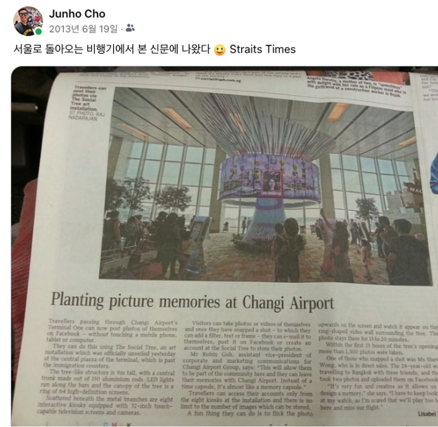 그것이 바로, 창이공항 T1의 ‘소셜트리’ 미디어 조형물이었습니다.
