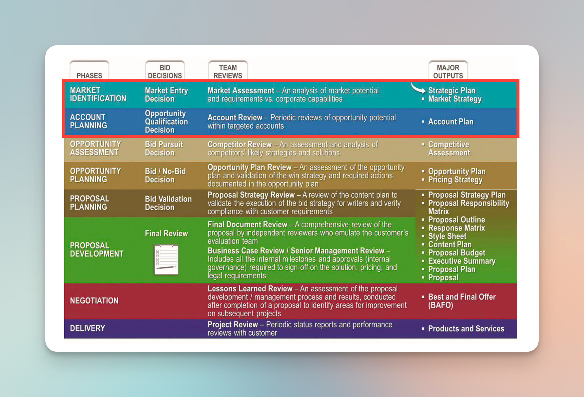 그러던 중, 미국의 유명 전략 컨설턴트와의 미팅에서 전혀 다른 시야를 얻게 되었습니다. 미국에서는 무려 80% 이상의 입찰이 RFP가 게시되기 전에 이미 방향이 결정되어 있다는 것입니다. 일부 대형 기회는 사전 영업만을 위해 최대 12명 규모의 팀이 3년 전부터 준비한다고도 하더군요. 물론 규모가 작은 프로젝트의 경우 전담 팀 없이 개별 담당자가 사전영업을 진행해야 하지만, RFP가 나오기 전에 미리 움직이는 것이 업계에선 상식이자 필수였습니다. 다만, 이 작업은 단순히 ‘관계성’에 의존한 것이 아니라, 명확히 영업과 마케팅 활동에 가까웠습니다.