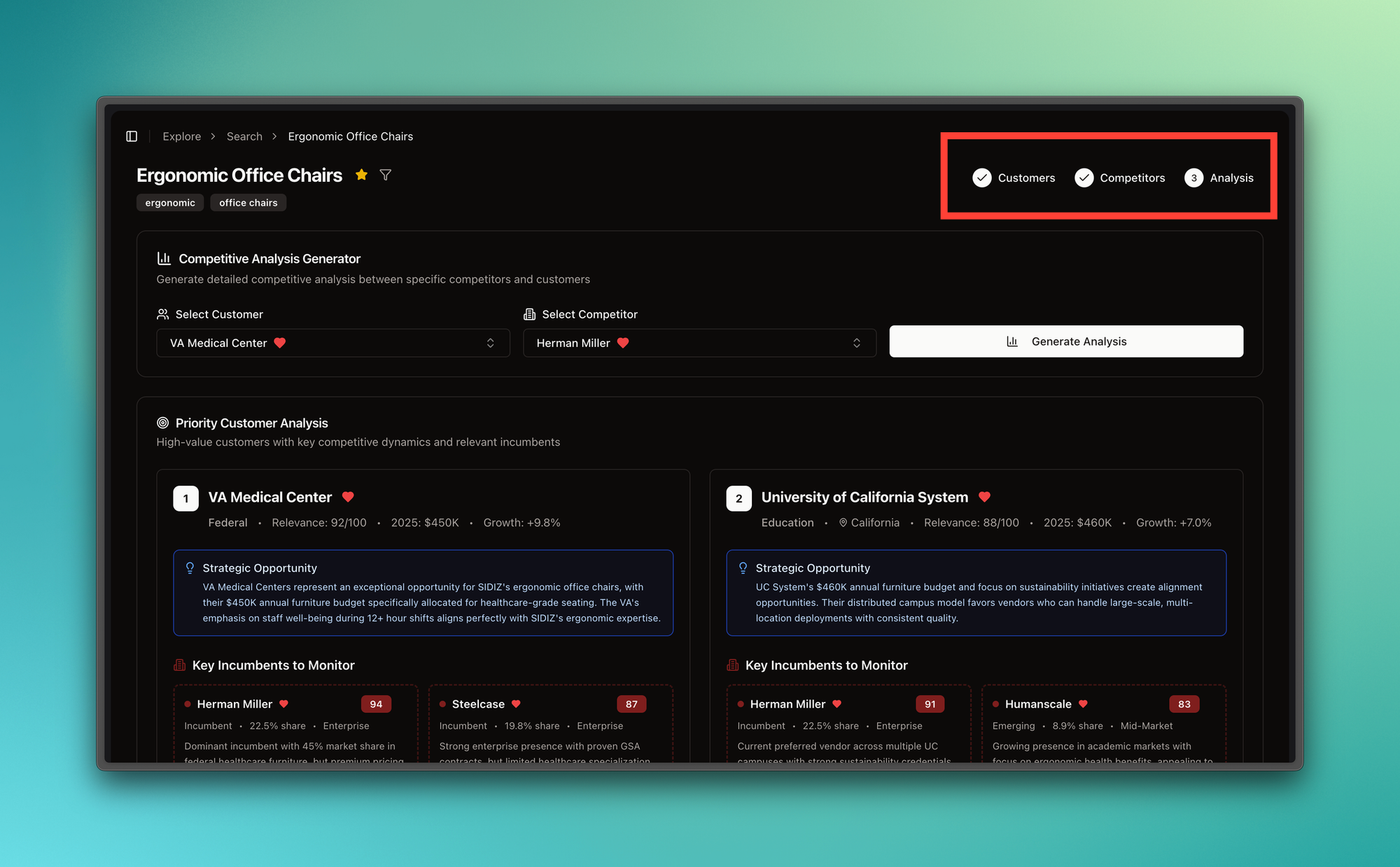 그래서 저희는 단순히 데이터를 제공하는 것을 넘어, Customers → Competitors → Analysis의 단계별 흐름을 따라 관계를 주도적으로 형성할 수 있도록 유도하는 솔루션을 만들어야겠다는 가설을 세우게 되었습니다.