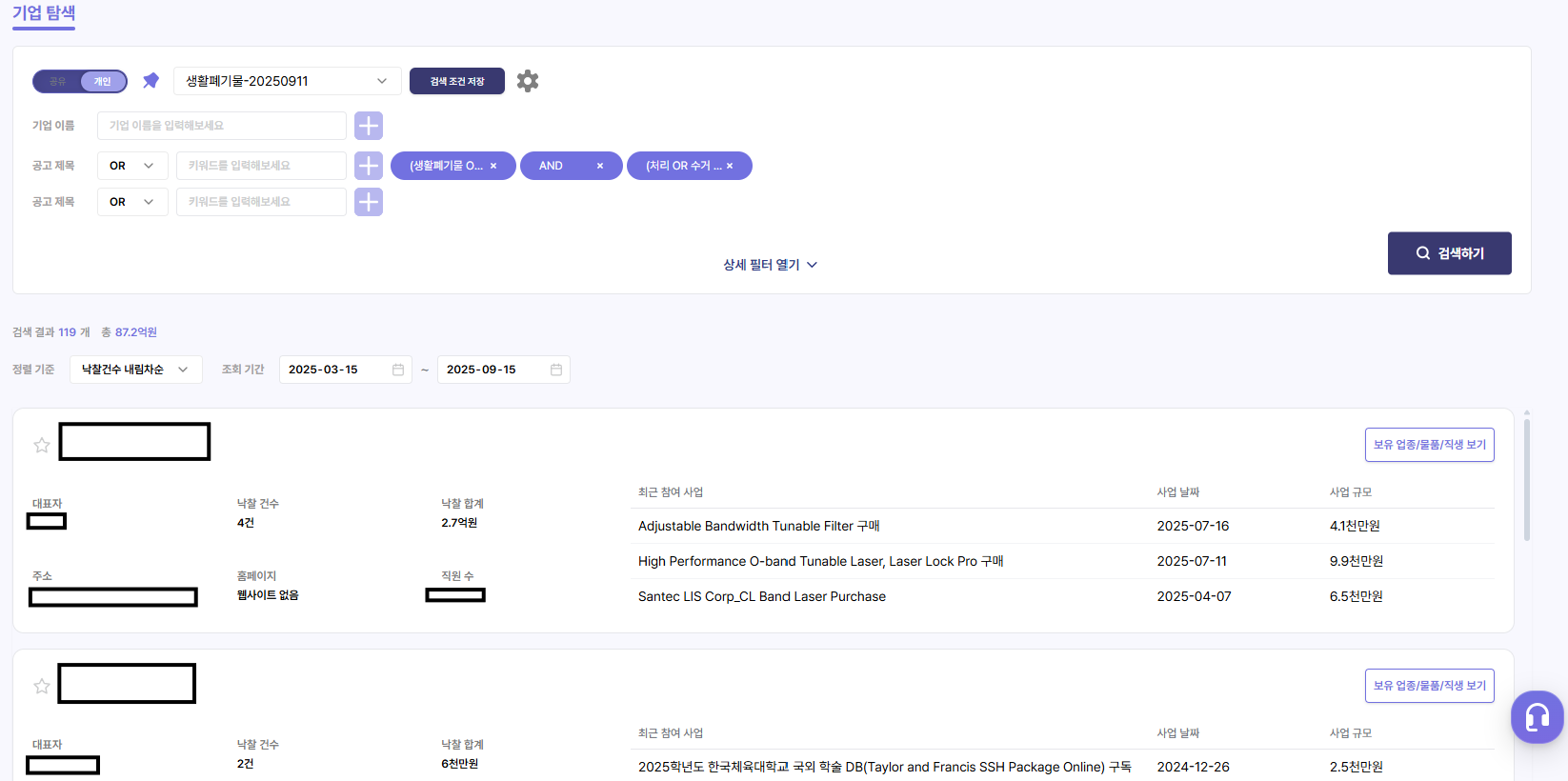 이제 단순히 기업 이름으로만 검색하는 것이 아니라, 인공지능·특허·에듀테크 등 특정 분야를 선택하면 관련 기업들을 한눈에 확인할 수 있습니다. 또한 각 기업의 최근 1년 수주 현황, 투찰율, 경쟁사와의 입찰 결과 비교, 주요 파트너사와의 협력 관계까지 체계적으로 분석할 수 있습니다.