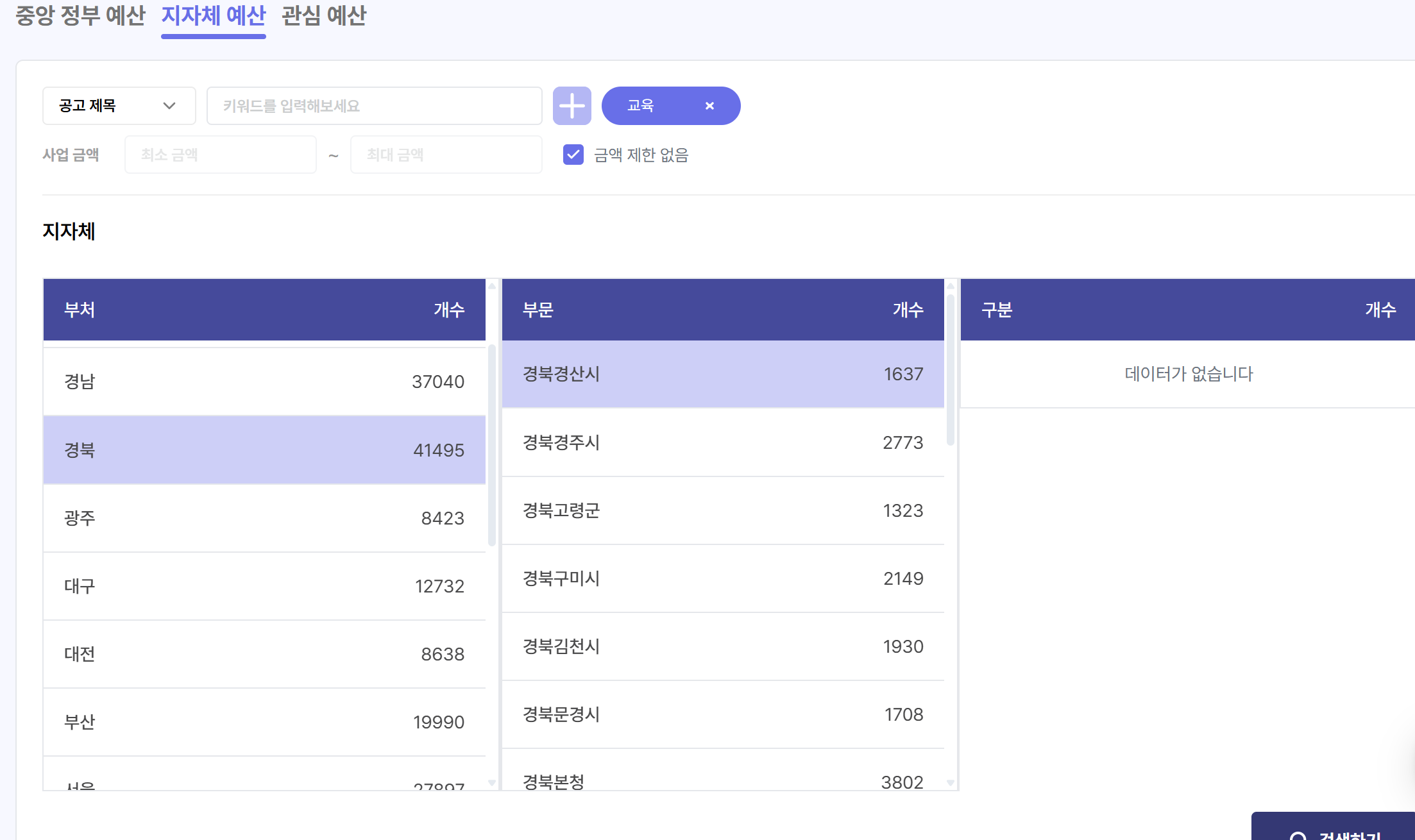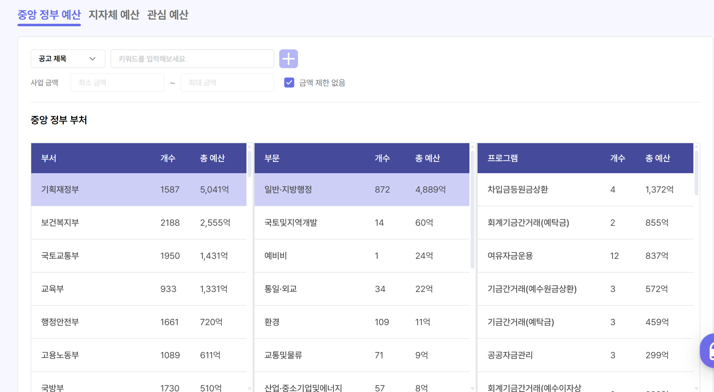 - 정부 예산: 17개 부처, 243개 지자체의 2025년 예산 내역과 원문을 키워드별 추출·열람