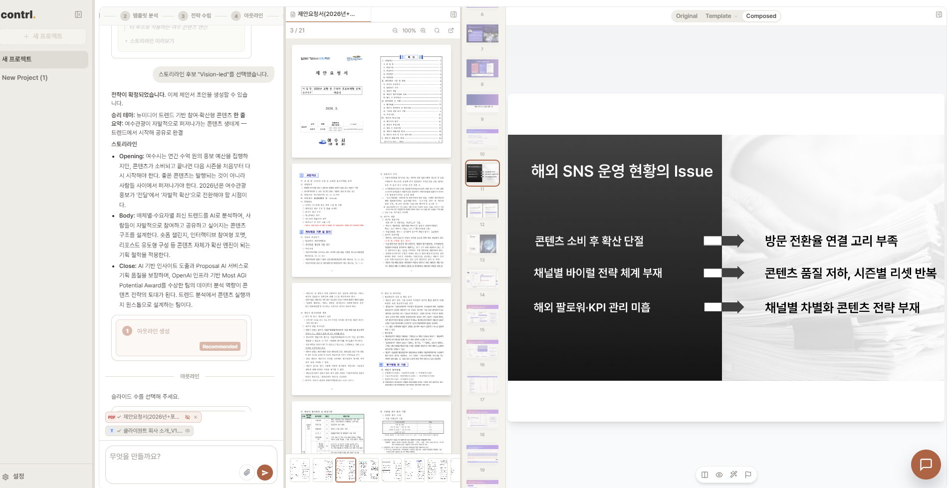 전략 추천의 근거를 상세히 보여주도록 개선했다. 어떤 문서의 어떤 부분을 바탕으로 추천했는지, 특정 섹션에 슬라이드를 몇 장 배정했는지, 해당 섹션이 어떤 요구 사항과 연결 되는지를 함께 확인할 수 있다.