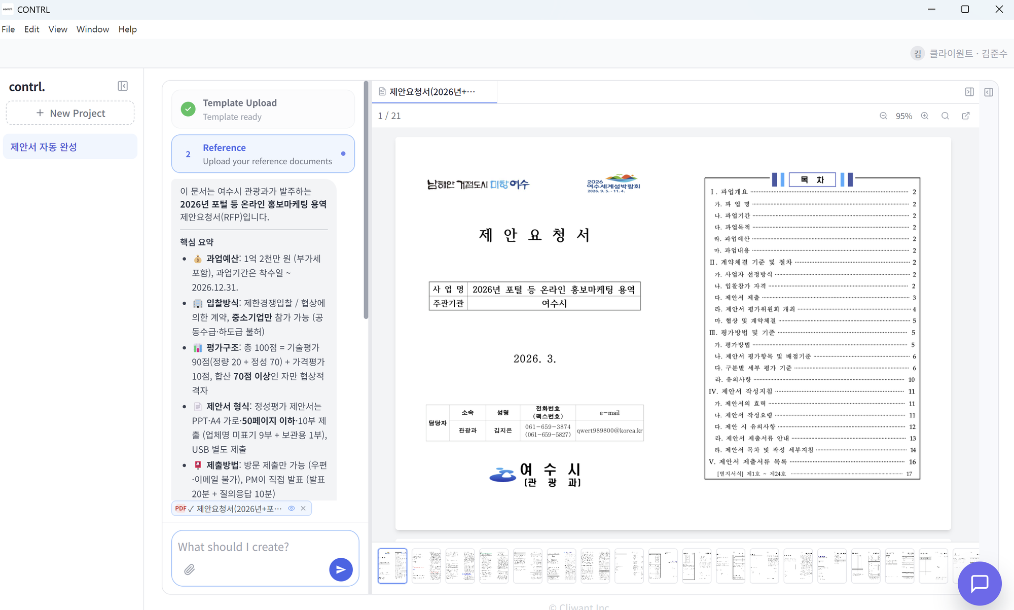 TL;DR: 클라이원트가 RFP 업로드만으로 제안서 초안을 자동 완성해주는 Contrl 서비스의 무료 클로즈 베타를 진행합니다. 우리 회사 PPT 템플릿 그대로 유지하면서, AI가 기획부터 초안까지 자동 생성합니다.