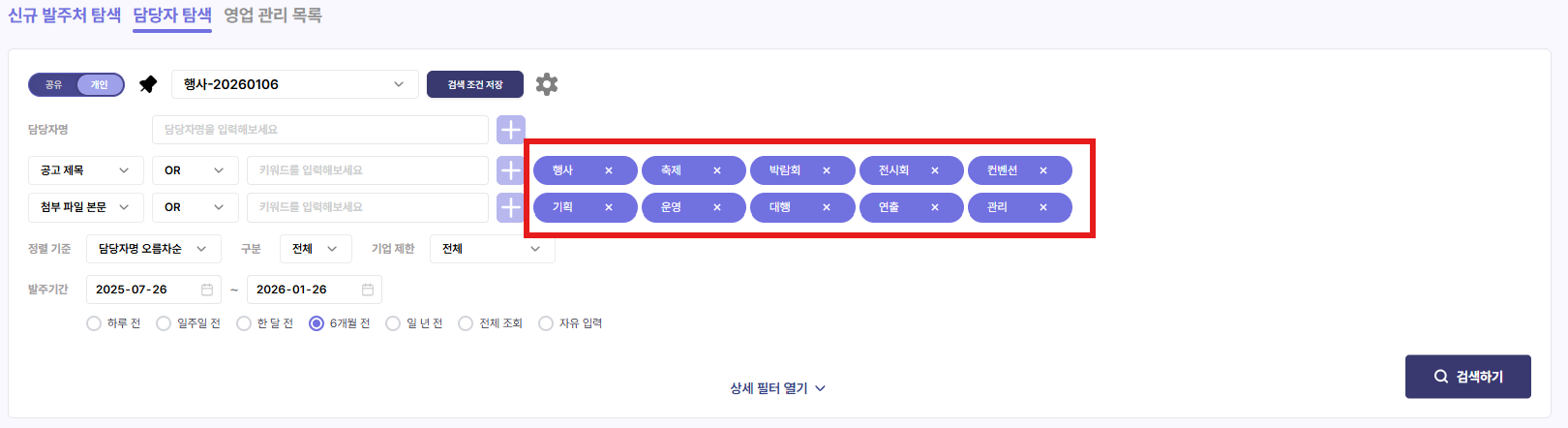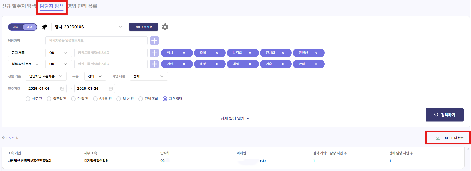 1️⃣ 담당자 탐색: 원하는 키워드를 입력하면, 과거 해당 키워드로 발주를 냈었던 담당자의 정보를 제공해드립니다.
