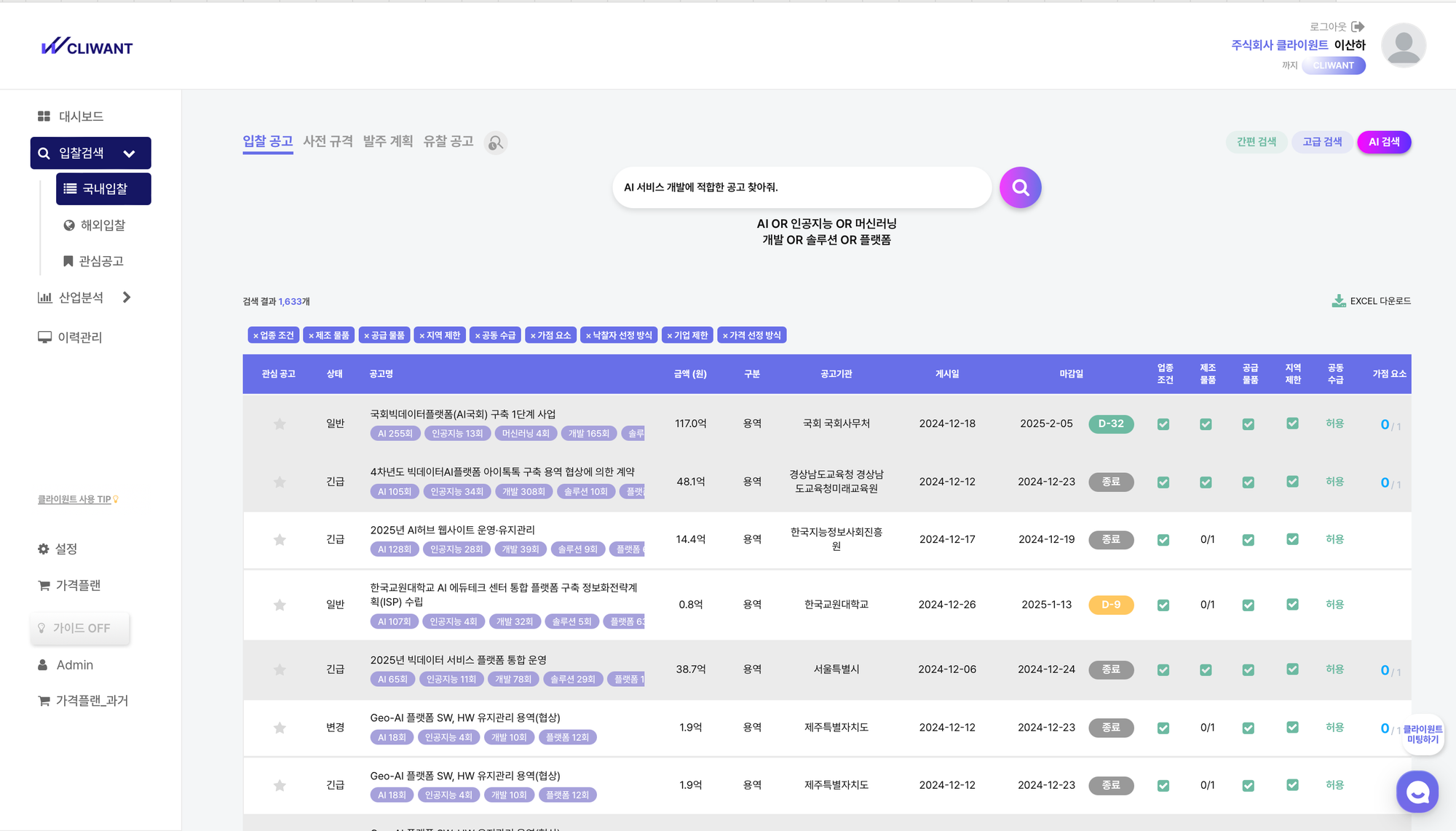 수십 페이지 RFP를 3분 만에 분석하고, 나라장터·해외 입찰까지 한 곳에서 검색. Cliwant 도입을 상담받아보세요.