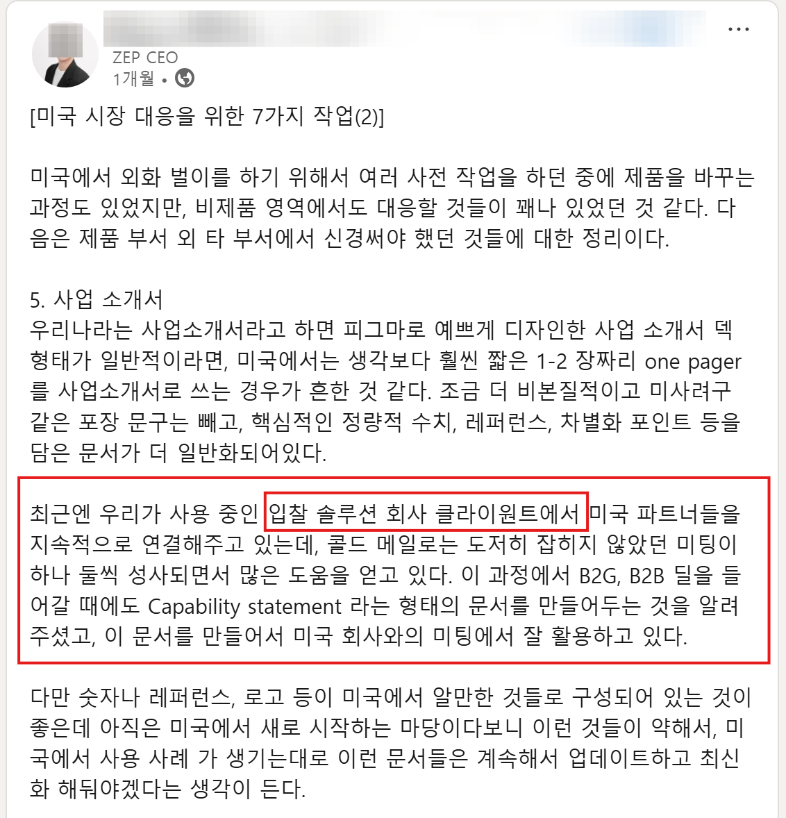 대표적인 사례로, ZEP(메타버스 에듀테크 기업) 대표님께서는 저희 도움 이후 감사의 마음으로 링크드인에 직접 후기를 남겨주셨습니다.