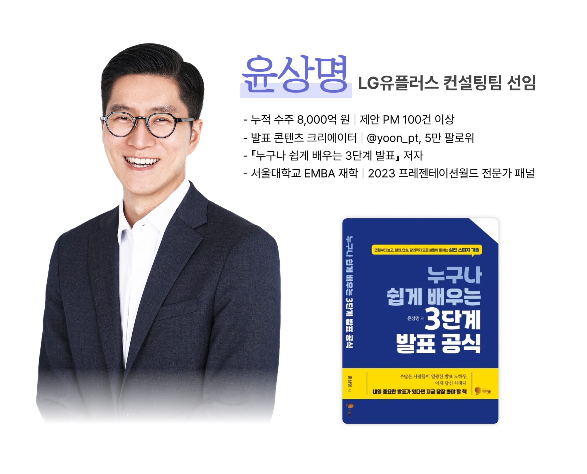 안녕하세요. 저는 LG유플러스에서 130건이 넘는 입찰을 제안해오며, 총 8,000억 원 이상을 수주한 입찰 제안 전문가입니다. 사내 프레젠테이션 강사로도 활동하면서 발표 교육 문화를 만들어가고 있고요. 발표 분야 1급 전문가 자격을 보유하고 있고, 프레젠테이션월드 전문가 패널로도 참여했어요. 인스타그램 @yoon_pt 계정에서 5만 명과 소통하며 발표와 커뮤니케이션 콘텐츠를 나누고 있고, 『누구나 쉽게 배우는 3단계 발표공식』이라는 책도 직접 집필했습니다. 발표를 잘하고 싶은 분들에게 꼭 필요한 내용을 쉽고 체계적으로 알려주는 사람이고 싶습니다!