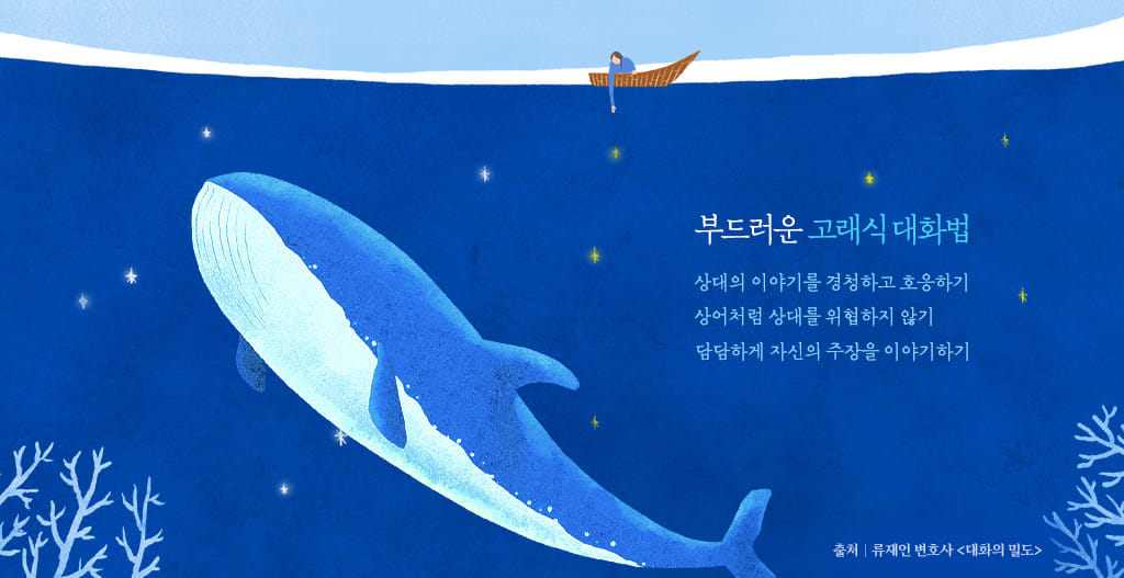 류재언 변호사가 제시한 인상적인 개념은 바로 ‘고래식 대화법’입니다. 이 개념은 삼성 전 계열사에서 사용하는 KNOX 포털의 로그인 화면에도 인용될 만큼 파급력 있는 메시지입니다.