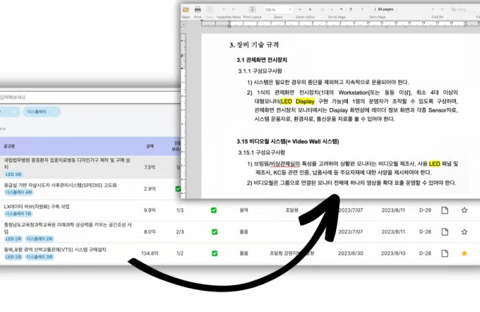나라장터에는 1년에 44만건의 공고가 올라온다. 입찰 기업들은 RFP만 44만건, 그 안에 첨부파일까지 100만건이 넘는 한글 문서를 일일이 분석해야 하는 상황이다. 더군다나 특정 키워드를 검색하면 제목에 해당 키워드가 포함된 공고만 확인 가능하다.