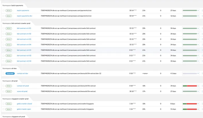 이제는 모듈도 많아져서 더 이상 SSH로 들어가 crontab으로 관리하기는 어렵고, 주니어 개발자분들도 배포를 더 편리하게 할 수 있도록 쿠버네티스(Kubernetes)를 도입했습니다. 예전에 스타트업에 다닐 때, 저보다 몇 배는 뛰어났던 CTO님 밑에서 어깨너머로 배운 것을 바탕으로 꾸역꾸역 물고 늘어졌더니 결국 만들어지더군요.