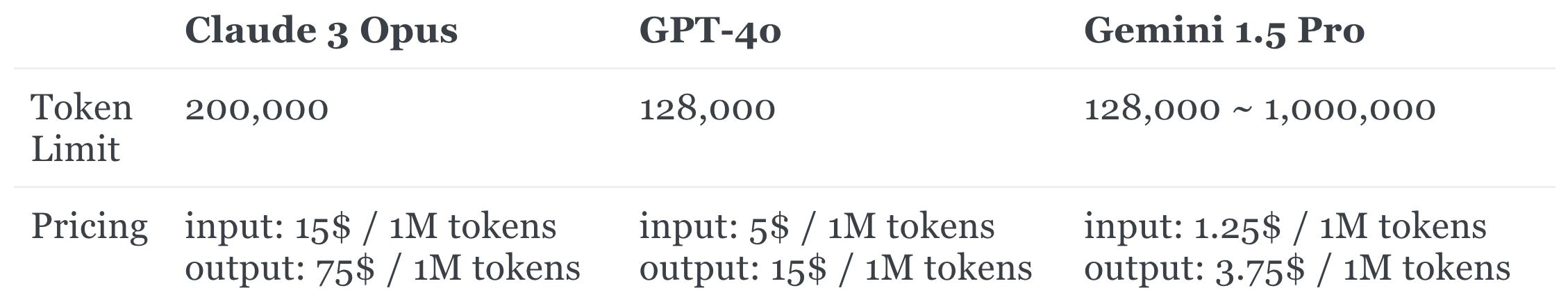 입찰 공고문에서 제출 서류를 추출하려면 많은 텍스트를 입력해야 하므로 토큰 제한이 높아야 합니다. 또한, 공고문의 복잡한 문맥을 이해하고 정확한 결과를 제공해야 하므로 높은 성능이 요구됩니다. 따라서 클라이원트는 아래와 같은 모델들을 선택해 테스트를 실행했고, 가장 높은 정확도를 보인 GPT-4o를 선택했습니다.