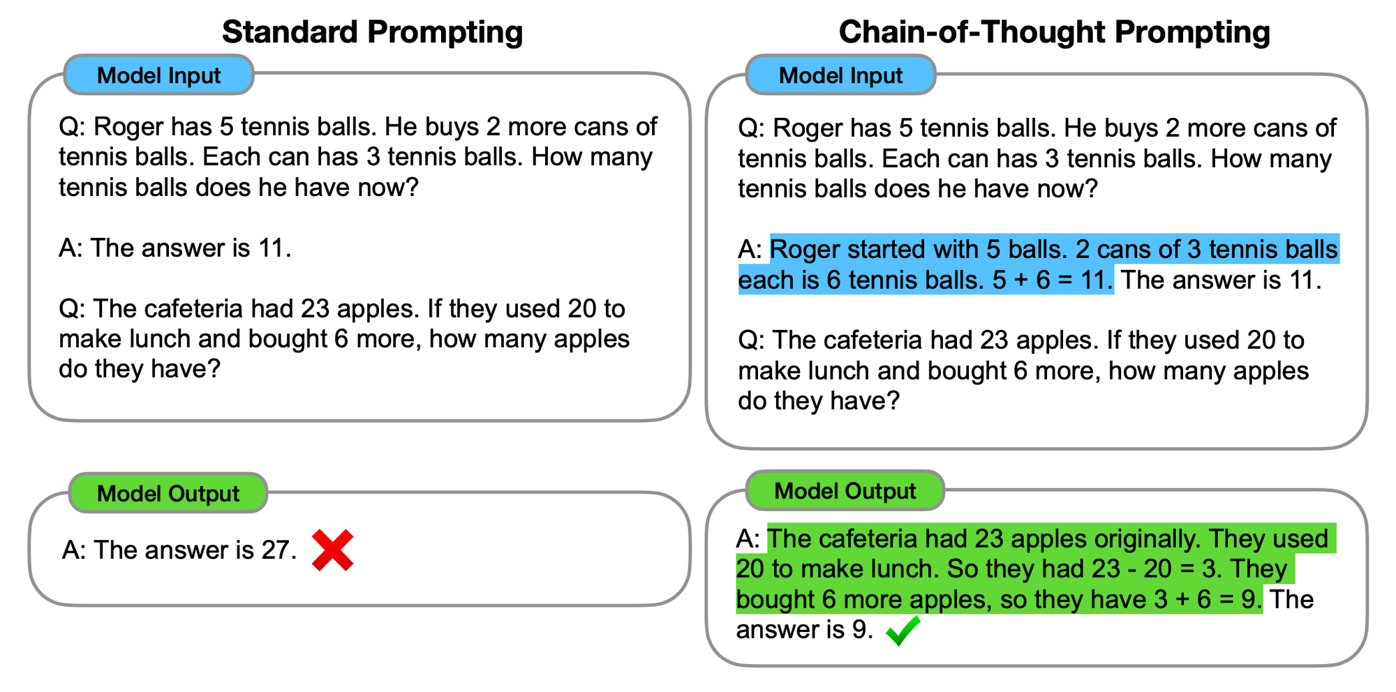 중간 추론 단계를 추가하여 사고 과정을 거치면 LLM의 성능이 향상될 수 있습니다. Chain-of-Thought Prompting은 LLM이 복잡한 추론을 수행하기 위해 생각을 말로 표현하게 하거나 단계별 추론 과정을 따르게 합니다.