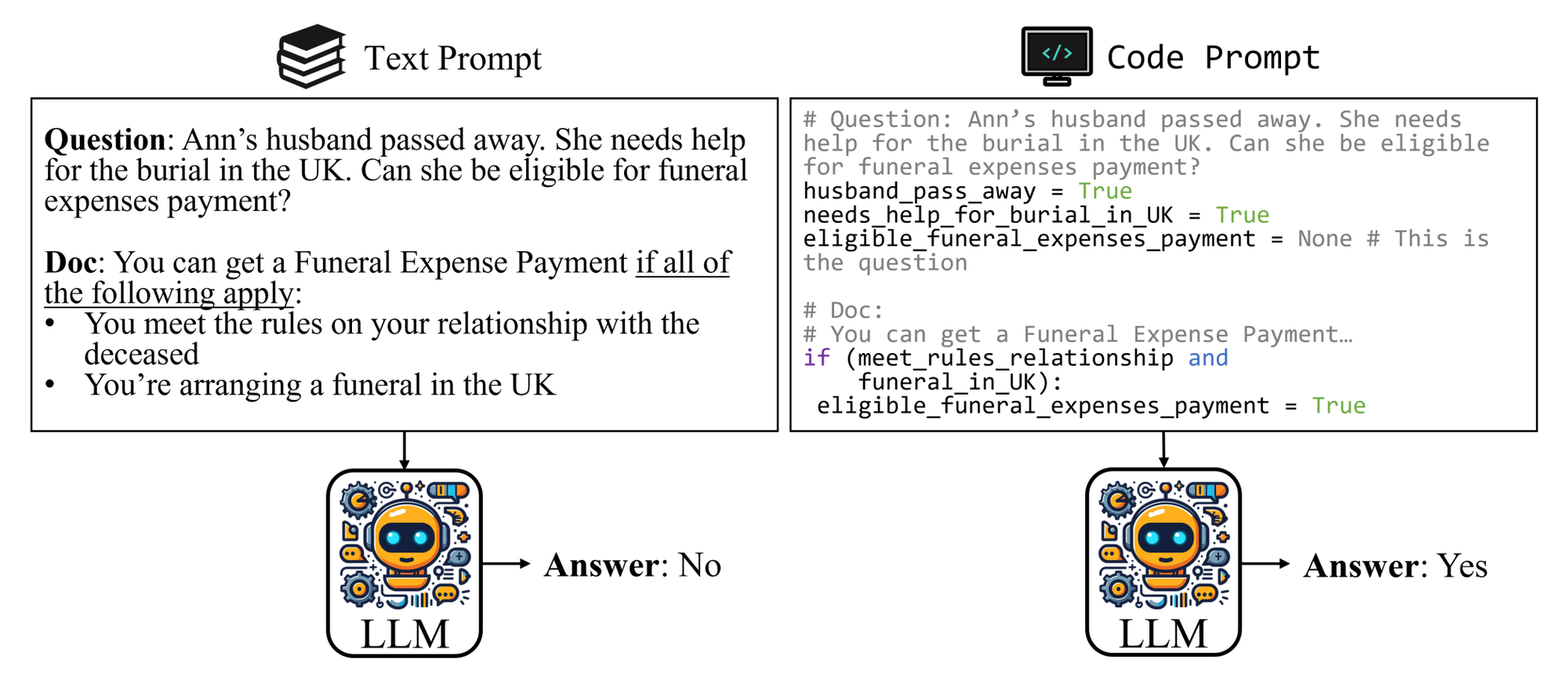 Code Prompting은 자연어 문제를 코드로 변환하여 프롬프트에 사용하는 방법입니다. 이 방법은 특정 조건의 충족 여부에 따라 다른 결론을 도출해야 하는 경우에 유용합니다. 자연어로 길게 설명하는 것보다 더 간략하게 표현하면서도 LLM의 성능 향상을 이끌 수 있습니다.
