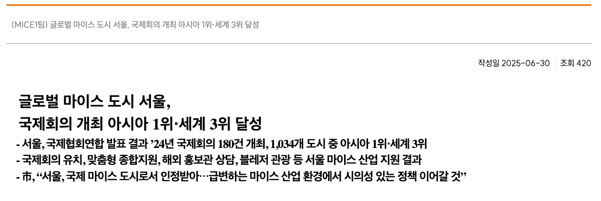 더불어 긍정적인 신호는, 한국 MICE 산업이 아시아 1위, 글로벌 3위에 오를 만큼 안정적이고 매우 큰 시장이라는 점입니다(출처: 서울관광재단).