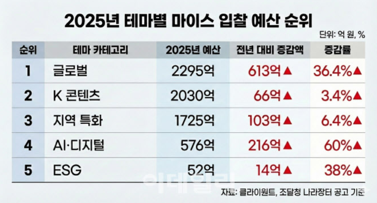 TL;DR: 작년 마이스(MICE) 분야 입찰에서 AI 관련 사업이 전년 대비 60% 성장했습니다. AI와 디지털 분야가 공공 입찰 시장의 핵심 성장 동력으로 부상하고 있습니다.