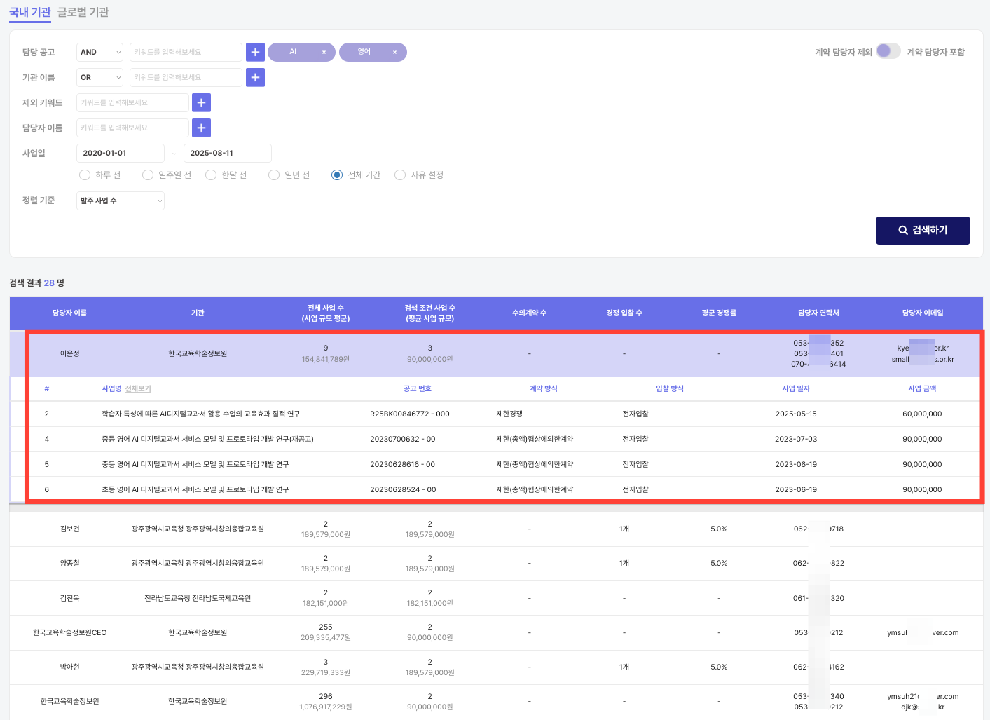 클라이원트는 나라장터를 포함해 국내 130여 개 공공기관, 대학교, 병원, 은행 등 공개 입찰 데이터를 모두 확보하고 있습니다. 이를 기반으로 영어 교육 관련 B2G 시장을 분석한 결과, 2024년 기준 연간 약 670억 원 규모임을 확인했습니다.