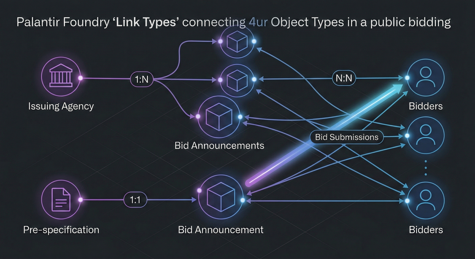 - Link Type은 Object 간 연결을 정의하며, 1:1(일대일), 1:N(일대다), N:N(다대다) 세 가지 관계 유형을 지원한다. 하나의 입찰공고에 여러 투찰이 연결되면 1:N, 여러 업체가 여러 입찰에 참여하면 N:N 관계다.