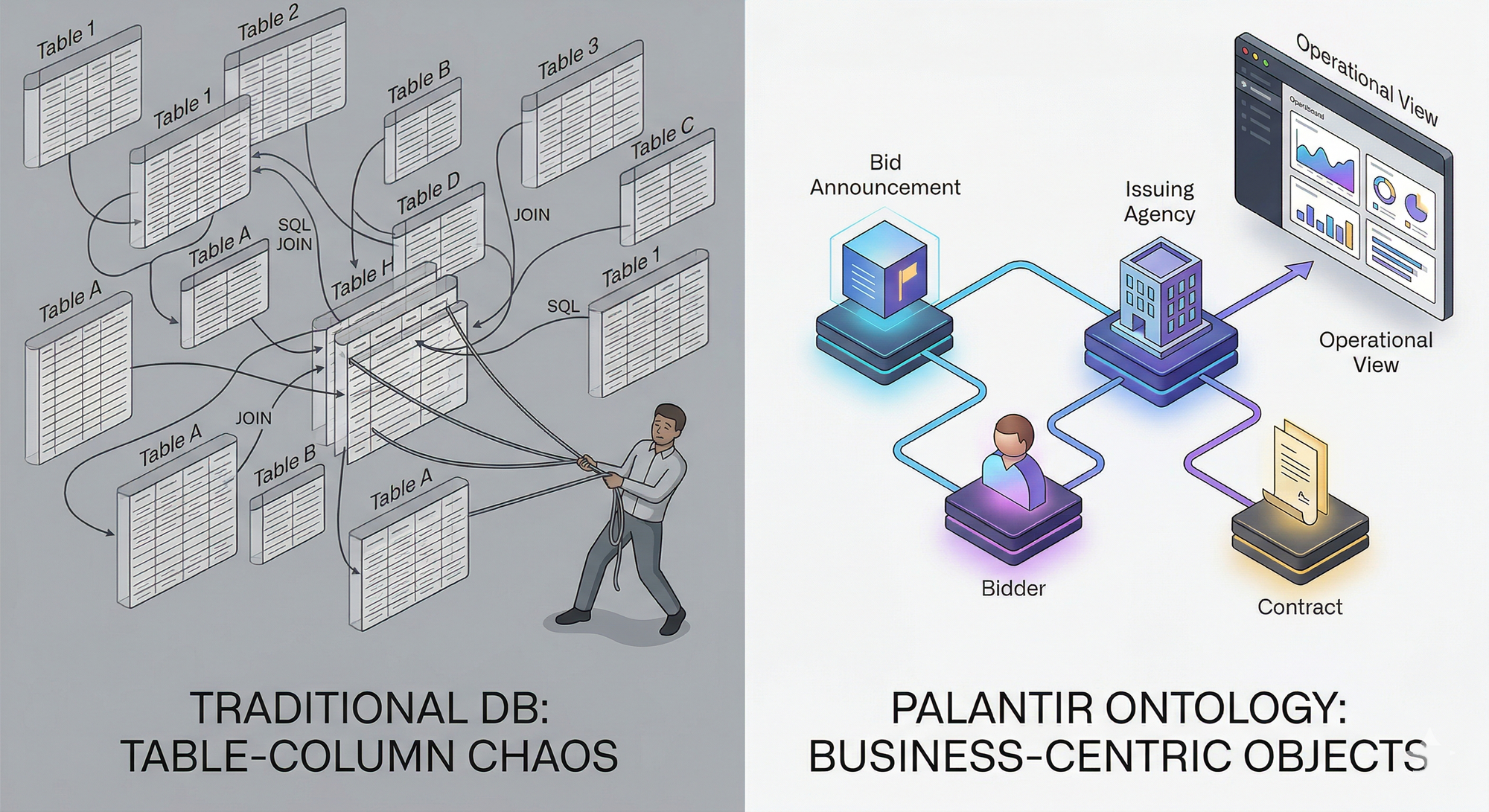 팔란티어 파운드리의 온톨로지는 Object, Link, Action 세 축으로 구성된다. 데이터베이스 테이블 대신 비즈니스 언어로 데이터를 다루는 구조를 공공입찰 데이터 모델링 사례로 풀어본다.