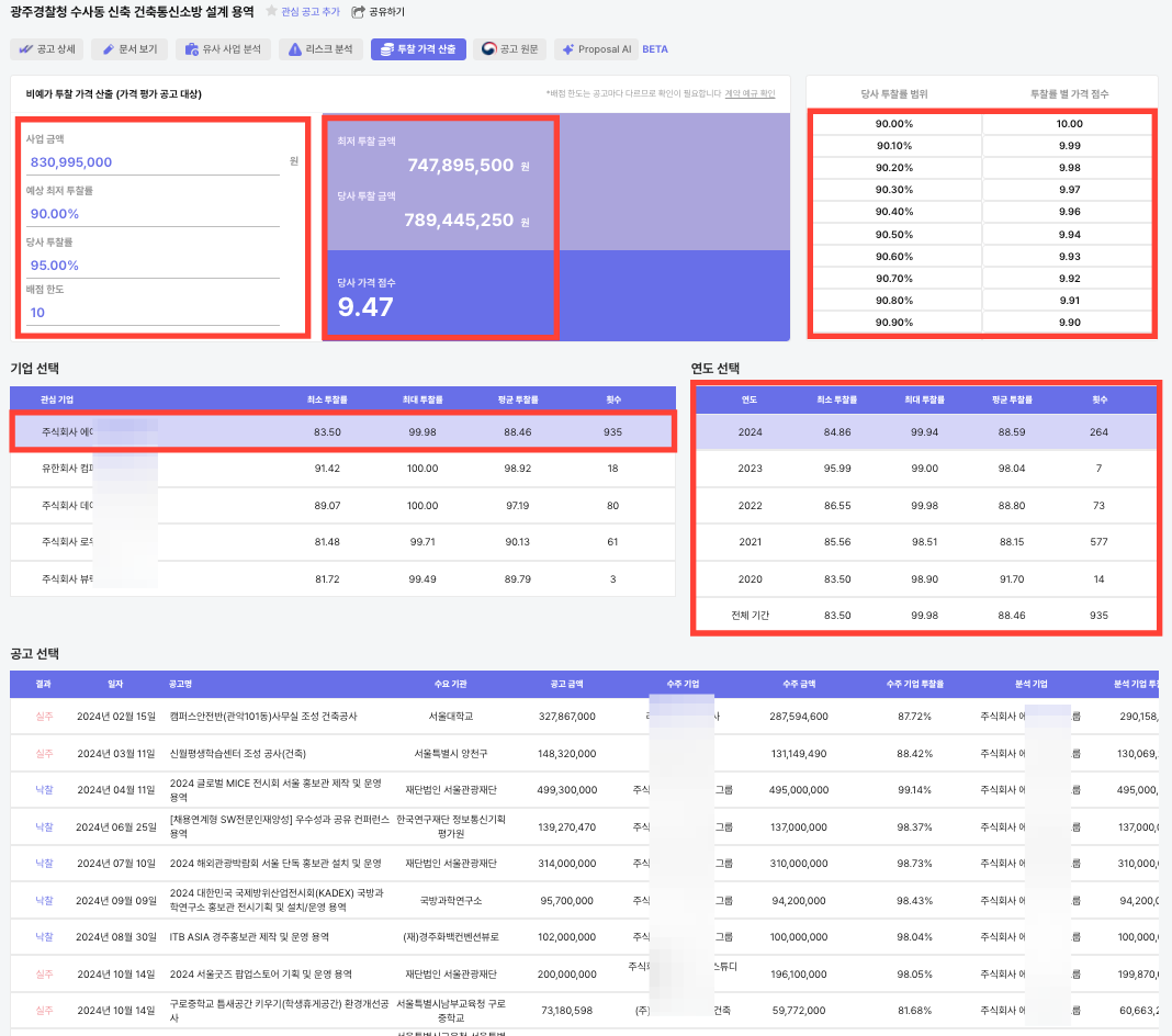 현재 클라이원트에서는 경쟁 기업의 지난 5년간(2020년~2024년) 평균·최고·최저 투찰률 데이터를 제공하여, 이번 입찰에 참여할 경우 대략 어느 수준의 투찰률이 예상되는지 벤치마크할 수 있도록 돕고 있습니다. 또한, 특정 투찰률로 입찰할 경우 경쟁사의 투찰률과 비교했을 때 어느 정도의 가격 점수를 받을 수 있을지 과거 데이터를 기반으로 분석하는 기능도 제공합니다.