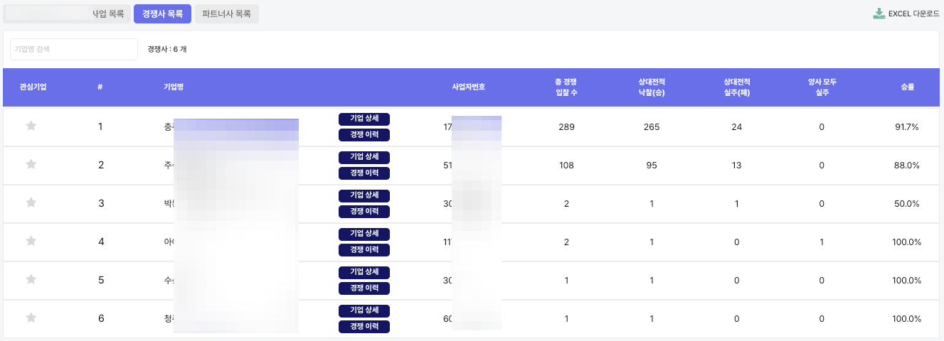 ※ 기업별 수주 성공률은 (개찰 결과 1등으로 선정된 횟수) / (입찰한 횟수)를 기준으로 산출하였습니다.