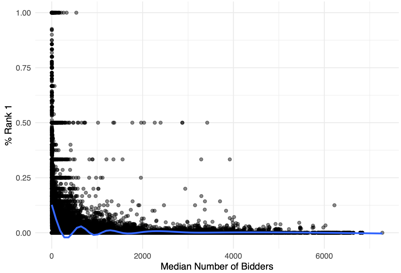 분석 결과, 그렇지 않았습니다. 이들의 수주 성공률이 높아 보이는 이유는 단순히 입찰 참여 횟수가 적었기 때문입니다. 상위 5% 기업 중 50%는 2024년 한 해 동안 4번 이하로 입찰했으며, 16번 이상 입찰한 기업은 10%에 불과했습니다.