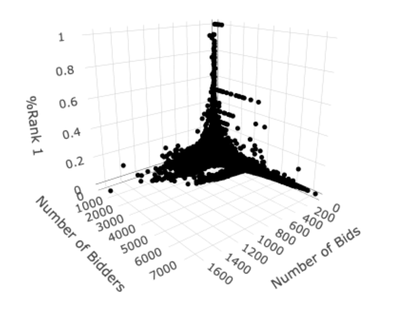 결론적으로, 치열한 경쟁이 이루어지는 일반적인 복수 예가 입찰 환경에서 지속적으로 투찰하면서도 높은 수주 성공률을 기록한 기업은 단 한 곳도 없었습니다(3D Scatter Plot 참고).