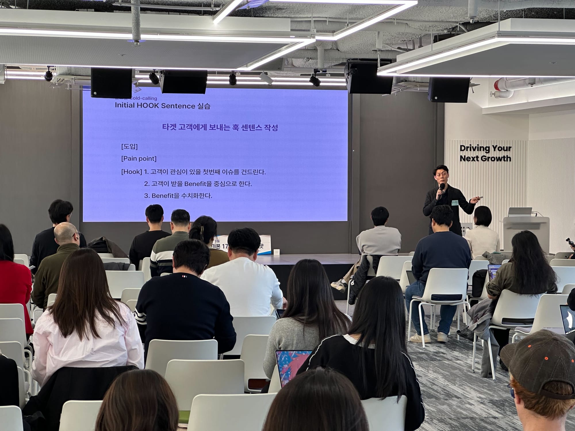 해당 콜드콜을 위해 클라이원트 사업 본부장 준연님이 간단한 세일즈 프로세스 강의를 진행해 주셨습니다.