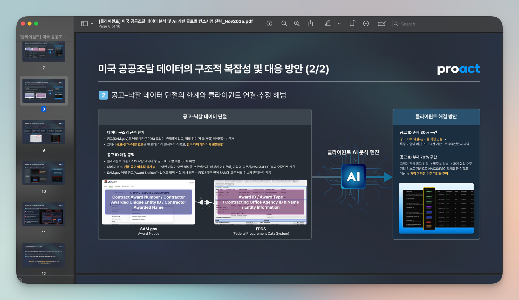 이러한 방향성 아래, 저희 미국 입찰 서비스 Proact의 방법론을 아주 디테일한 수준까지 심도 있게 공개합니다. 발표 자료에는 작년 말부터 꾸준히 연구해 온 미국 조달 데이터 구조와 클라이원트만의 노하우가 풍부하게 담겨 있습니다. 다만 해당 내용을 기반으로 저희 시스템을 그대로 복제하거나 유사하게 활용하시는 것은 매우 곤란합니다. 😅 그럼에도 불구하고 모든 로직을 과감하게 공유하는 이유는, 저희가 이 방법론에 충분히 자신이 있고, 동시에 이를 그대로 재현하기는 쉽지 않다고 판단하기 때문입니다.