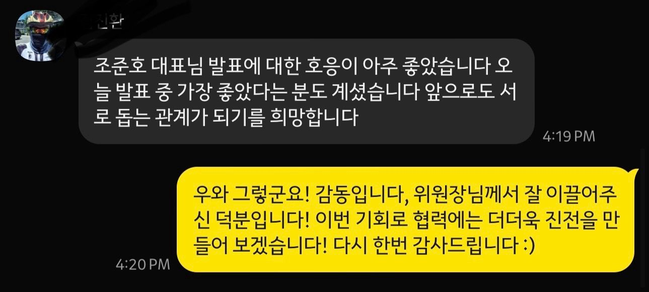서울 조달청 건물에 저희가 처음 방문하기도 했고, 어떤 분들이 얼마나 오실지, 기대 수준은 어떨지, 또 저희 발표를 어떻게 받아들여 주실지 쉽게 예상하기 어려워 내심 긴장했는데요. 발표를 마친 뒤 현장에 계시던 백승보 조달청장님을 비롯해 조달청 관계자분들, 국회의원분들, 교수님들과 여러 기업의 대표님들까지 저희 내용에 큰 공감을 보내 주시고, 이후 팔로업 미팅까지 먼저 요청해 주셔서 정말 감사하고 다행스러운 마음입니다.