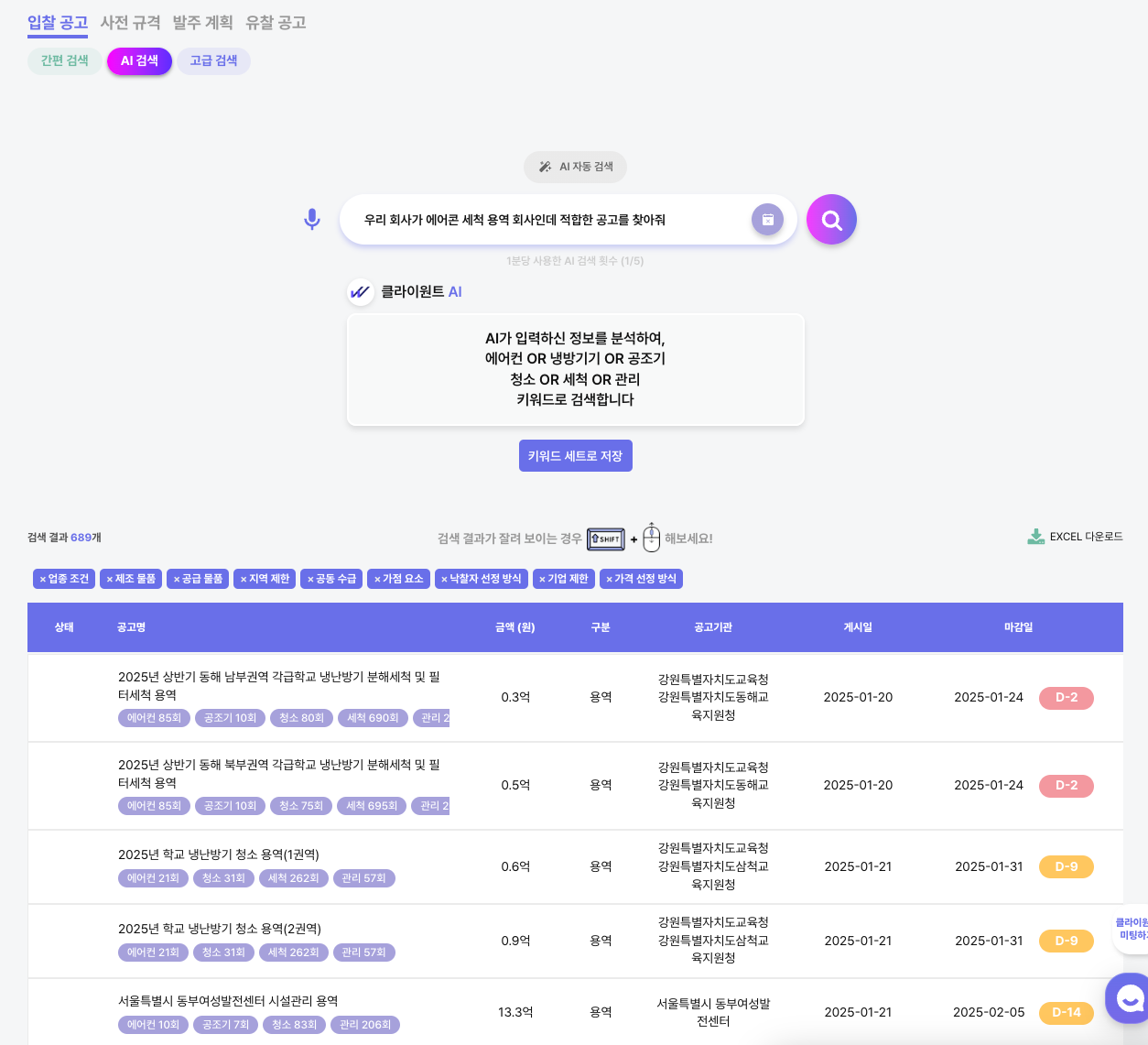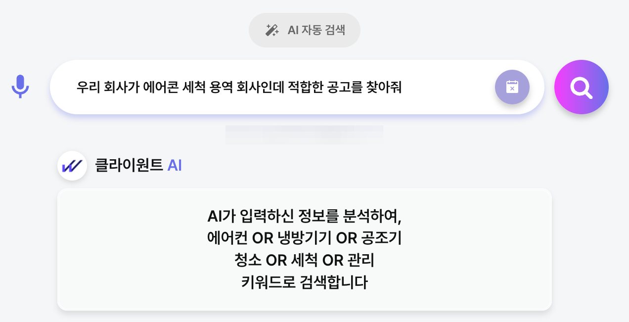 입찰 공고를 찾는 방법은 많지만, 어디서부터 시작해야 할지 막막한 순간이 있습니다. 이럴 때는 클라이원트의 새로운 'AI 검색' 기능을 활용해 보세요!
