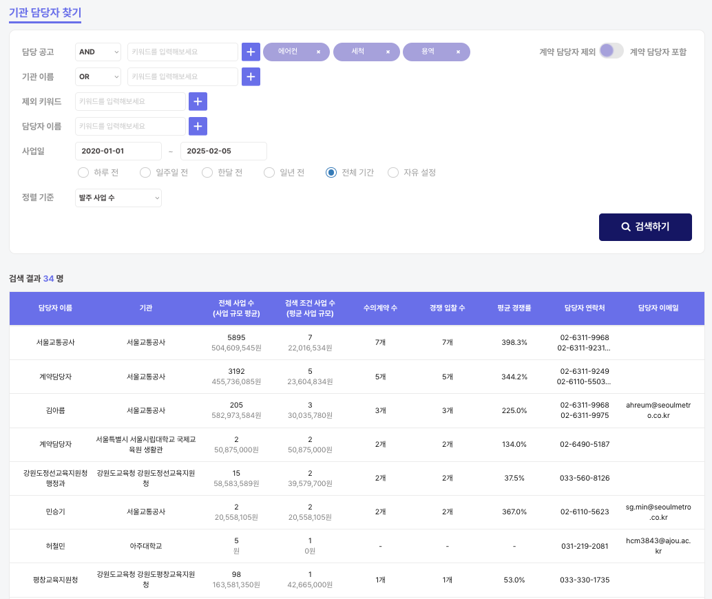 이제 필요한 담당자를 빠르게 찾아 사전 영업을 진행하고, 입찰 기회를 극대화할 수 있습니다. 🎯