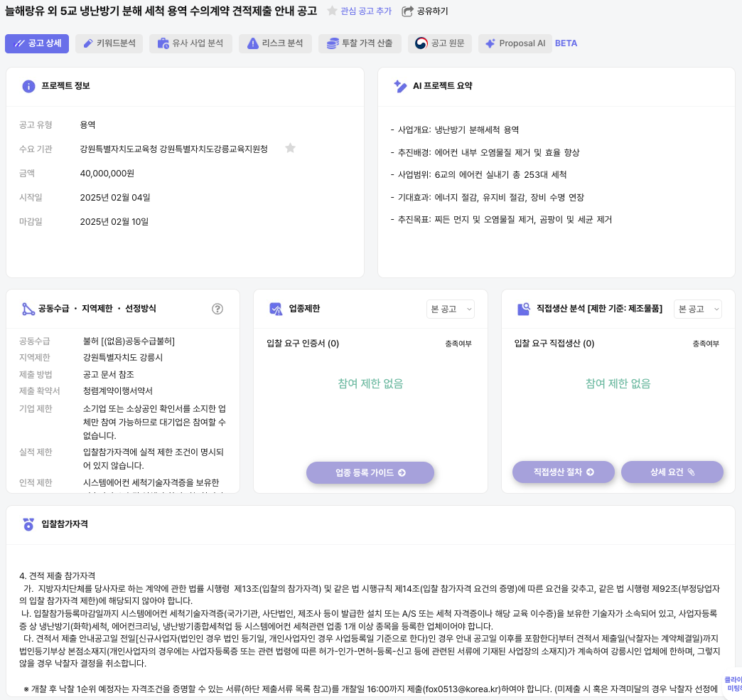 또한, 입찰 제안요청서(RFP) 파일에서 자동으로 사업 참여 가능 여부와 제한 조건을 추출해 한눈에 확인할 수 있도록 지원합니다.