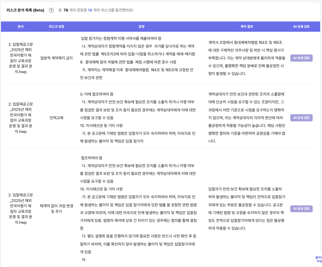 클라이원트는 특히 용역 사업에 초점을 맞춘 독소조항 리스트를 구축하고 있으며, 이를 지속적으로 개선하고 있습니다.