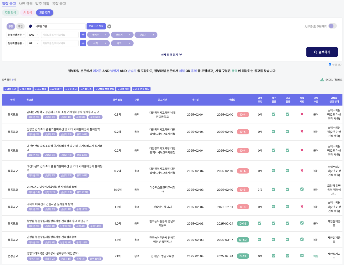 나라장터와 달리 클라이원트는 다양한 키워드를 AND 및 OR 조건으로 조합하여 세부 검색할 수 있습니다.