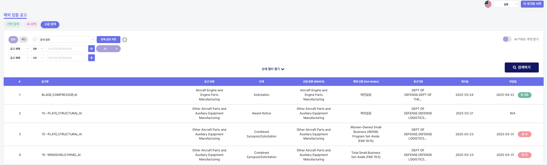 미국과 싱가포르 등 다국적 조달 공고를 한 번에 검색하고, 분산된 입찰 정보를 빠르게 파악할 수 있습니다.